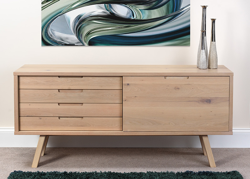 The traditional trestle table base has been given a 21st century contemporary update in the Bergen range. The sleek light oak top rests perfectly on the clean-cut modern legs with the essential central stretcher giving stability and style. The clean modern finish has also been applied to the matching sideboard which houses a cupboard with sliding door and drawers, and the coffee and console tables. All in all, this range offers an uncomplicated solution to any dining experience.