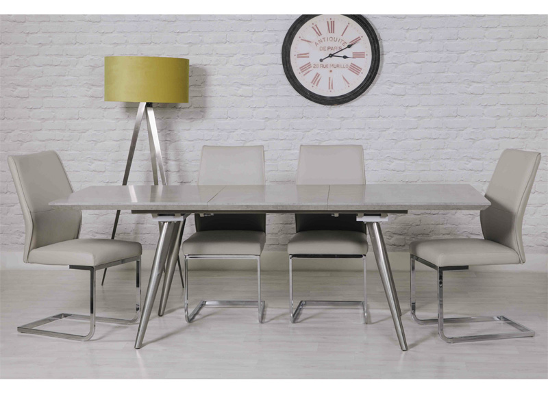 The Industrial Luxe trend continues to grow and a new addition to this section is the Chicago dining table. Available as a fixed or an extending table with ‘SmarTops®’ Technology, which means heat, stain and scratch resistant. The extending table when closed, offers seating for six and open seating for up to ten. The silver metal slender legs make tucking chairs under easy. The top is a mottled effect resembling polished concrete in a subtle grey. A fabulous contemporary dining table just, waiting for the addition of seating to make it complete.