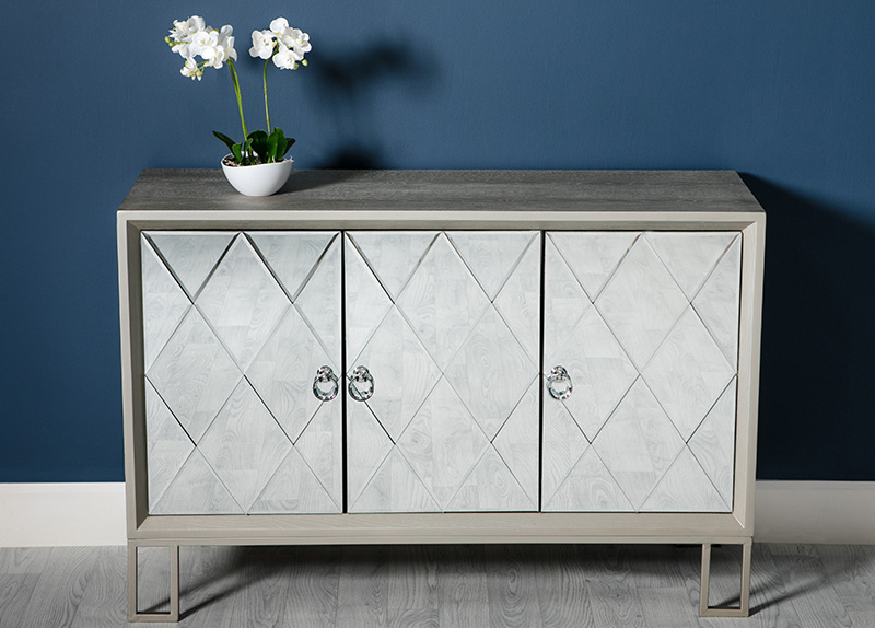 Add a little vintage inspired luxury to your room with the addition of the Diamond range of occasional pieces. The diamond cut glass drawer fronts and doors are housed by a wooden painted frame in a delicious vintage champagne colour which is matched to the painted metal frame forming the legs. Silver hoop drawer pulls complete this stunning range of furniture. Place throughout a living room or bedroom for a decadent elegant finishing touch.