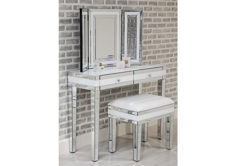 Add a hint of decadence to your scheme with the addition of the versatile Liberty range of white gloss and mirrored pieces. Attention to detail has been paramount in the design and construction of these stunning pieces with the inclusion of bevelled edges, crystal handles and glass tops for durability. This beautiful range will add a touch of charisma to a bedroom or living space offering ample space to hide away belongings in its generous drawers. A delightful dressing table, stool and folding mirror make a great beauty station. It is a must for those who like to keep their rooms light, airy and extremely glamourous.