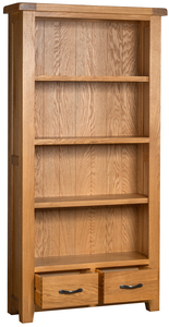 This large bookcase features 3 adjustable shelves and 2 drawers for additional storage.