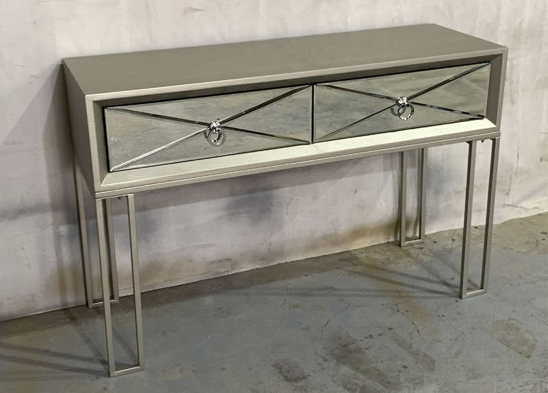 Add a little vintage inspired luxury to your room with the addition of the Diamond range of occasional pieces including a desk. The diamond cut glass drawer fronts and doors are housed by a wooden painted frame in a delicious vintage champagne colour which is matched to the painted metal frame forming the legs. Silver hoop drawer pulls complete this stunning range of furniture.