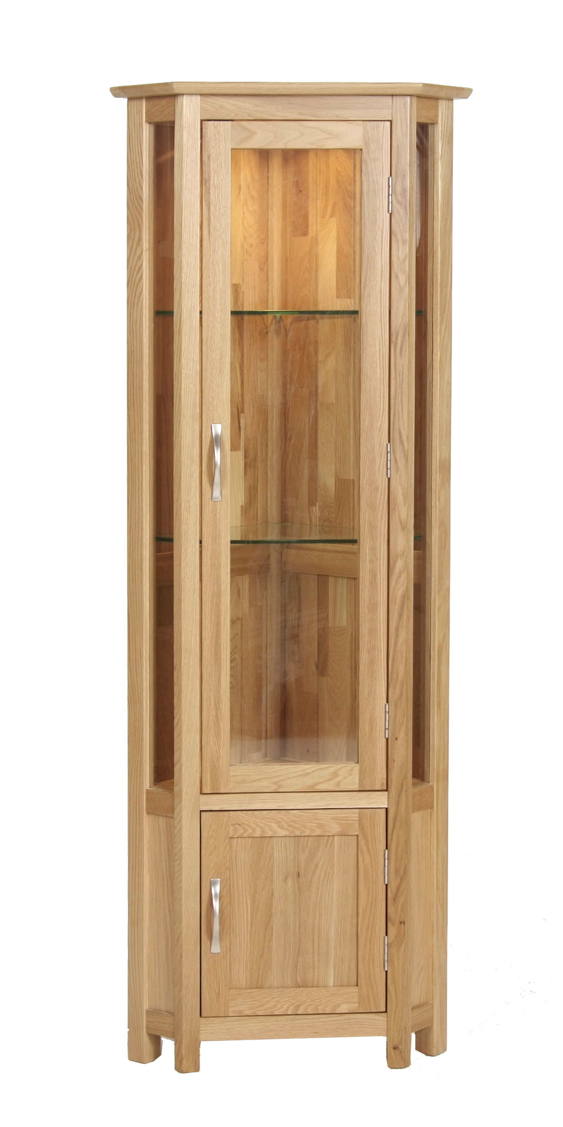 This uniquely shaped corner display cabinet features two adjustable glass shelves in the upper section, and one adjustable shelf in the cupboard section. Supplied with a white display light.