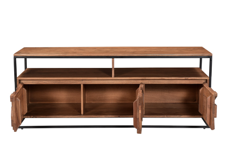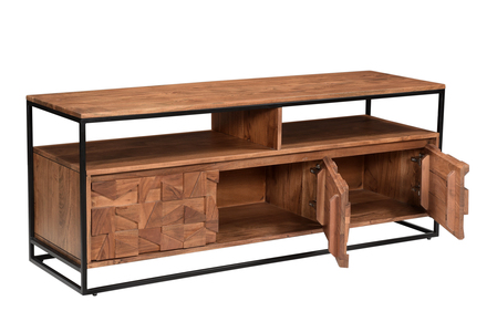 Axis has a cool loft living vibe with its black metal framing and carved Acacia wood. The block design is carved in such a way to offer different levels and shapes which add interest and allow the light to highlight different sections. There are a host of different pieces to work throughout the home.