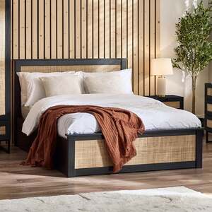 Experience the perfect fusion of style and functionality with the Padstow Ottoman Bed in Black. This captivating bed boasts an ornate weaved rattan headboard that adds a dash of modern elegance and retro charm to your space. Drawing inspiration from bohemian aesthetics, it effortlessly combines timeless appeal with contemporary flair. The sophisticated black finish makes a bold and chic statement in any bedroom. What sets this bed apart is its ingenious ottoman storage system— just lift the frame to access ample space for bedding, clothing, or other essentials. Mattress sold separately.