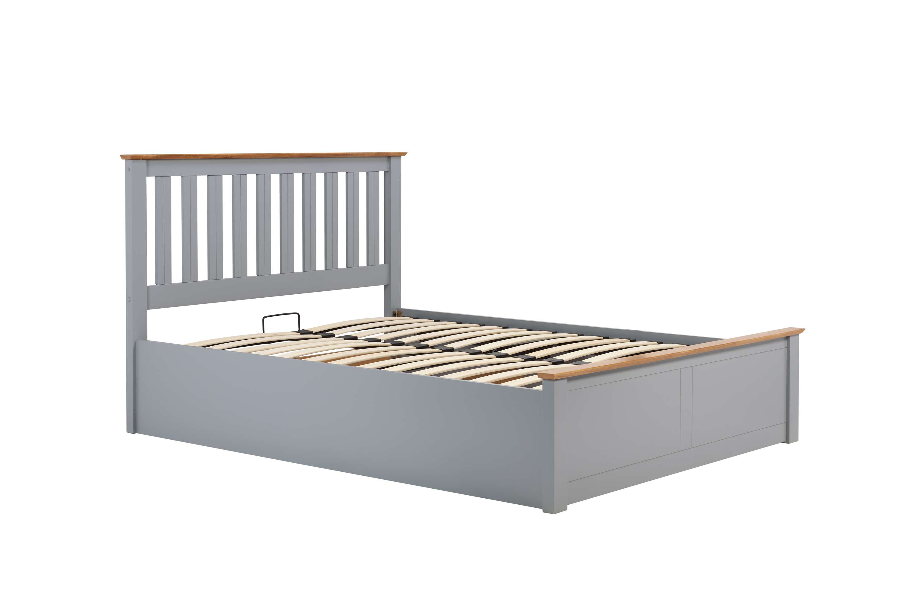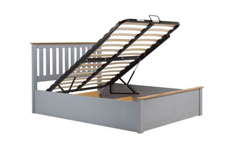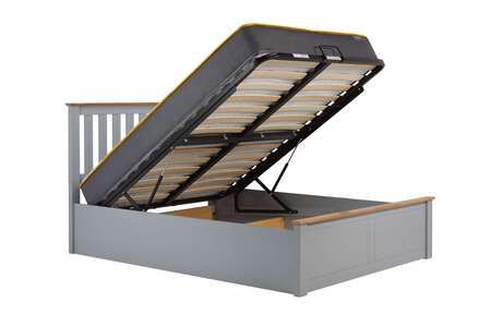 One of the highest quality finishes in the range, the Phoenix wooden Ottoman bed provides both class and practicality, with an opening base that provides plenty of storage. The bed is available in navy blue, pearl grey, stone grey, oak or white. Constructed from solid rubberwood, the oak option has MDF veneered side rails whereas the white option features MDF Melamine side rails. This frame has a sprung slatted base to give natural bounce, adjusting to where pressure is most exerted to provide greater comfort. A protective base board is also included. The gas piston strength on this frame is 588 N.The maximum weight load for the Phoenix Ottoman frame is 350 kg.Please note the mattress needs to be on the bed for the pistons to work. Birlea beds are only suitable for a UK standard size mattress and the recommended maximum mattress height is 203 mm.