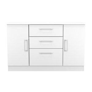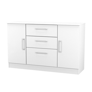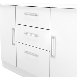 This wide storage unit has 2 storage cupboards and 3 central drawers making it perfect for any living room, dinning room or louge. Could also be used as a TV/Media stand or side board. A elegant modern range, with solid metal pull bar handles and comes in a range of scratch resistant gloss or matt finishes. All our furniture is made in the United Kingdom, to the highest quality. It is delivered direct to your location of choice by one of our two man delivery teams, and comes fully assembled (although legs may be removed to prevent damage in transit).